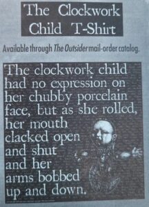 The Clockwork Child, which appears briefly in Countdown, became part of Pagan Publishing’s visual identity in the 90s and was much seen on tee-shirts. Its first appearance was in John Tynes’ short story ‘Ambrose’, and later reappears in other Delta Green publications including Insylum and Impossible Landscapes. Tynes reports that Ramsey Campbell bought a Clockwork Child shirt from him at a horror convention, and thus the circle is complete.