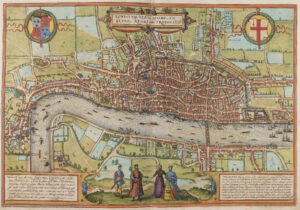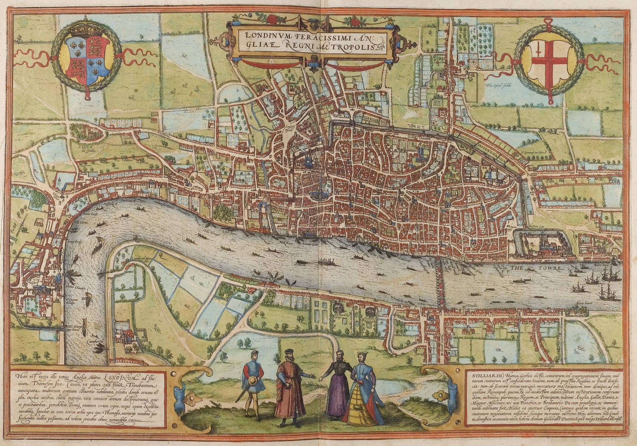 London in Tudor times had a population of around 50,000 in 1500, growing to over 200,000 by the end of that century. It was mostly centred around the old City of London, the area within the city walls (click the map to enlarge), but was beginning to spread westwards and northwards, encompassing existing settlements and villages as it grew. The river had one bridge and occasionally froze so thoroughly that ice fairs were held on its surface. The plague hit the city regularly: in 1563 it killed 17,404 Londoners. (For comparison, in two years the Covid pandemic killed just over 20,000 Londoners, in a city of ten million.)