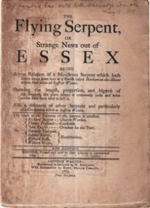 The Flying Serpent, or Strange News out of Essex was first published in 1669, one of the hundreds of ephemeral pamphlets printed each year containing news, opinion, poetry, and popular entertainment. A facsimile was released in the late 19th century. A few years ago James acquired a copy of this facsimile, digitised it and put it up on DriveThruRPG as a PDF, where almost nobody bought it apart from a writer, Sarah Perry, who based her bestselling novel The Essex Serpent (later a TV series) on it. Funny old world.