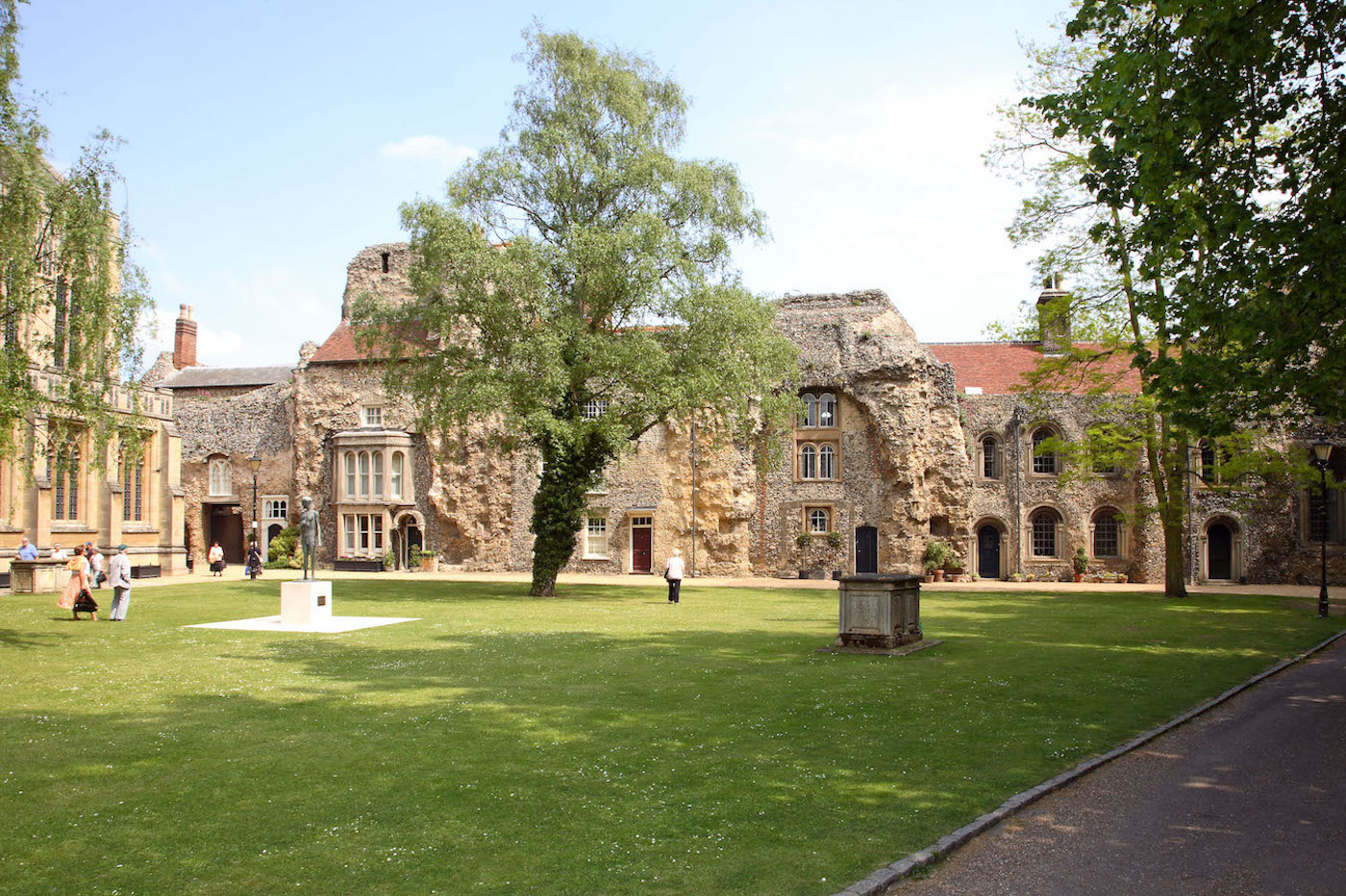 Bury St Edmunds, where chunks of the recent edition of Maelstrom are set, has a rich background that’s both historical and mythic. James mentions that his mother used to live in a house built into the ruins of the old Abbey (now known as the West Front): in this picture it’s the one in the arch, with the green door. The roof leaked and the garden was overhung by half of a medieval stone arch, threatening to collapse at any time, but it had been there for at least five centuries and might well last the same again. Below it is a picture of what the Abbey looked like at the height of its influence in the fifteenth century, for comparison.